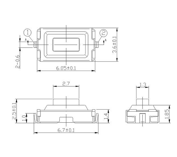 尺寸: 6.1X3.7mm 产品分类: 轻触开关 - B系列 / 3x6一型二型 应用 ※ 用于各种电子设备操作 ※ 音频设备,办公设备,通讯设备 ※ 测量仪器,电视机,电视录像机等 特点 ※ 高可靠的触点封装结构 ※ 大的按钮表面提高安装速度 ※ 回流可焊