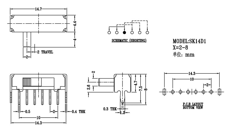 撥動開關主要技術參數: 使用功率/額定值:DC 50V 0.3A~1A 觸點電阻:< 100 mΩ 絕緣電阻:≥ 100 MΩ 耐壓:500V AC for 1 minute 撥動力:180~500gf 使用壽命:10000次 操作溫度:-16℃to+60℃ 儲存溫度:-40℃to+85℃ 符合標準:RoHs&Reach