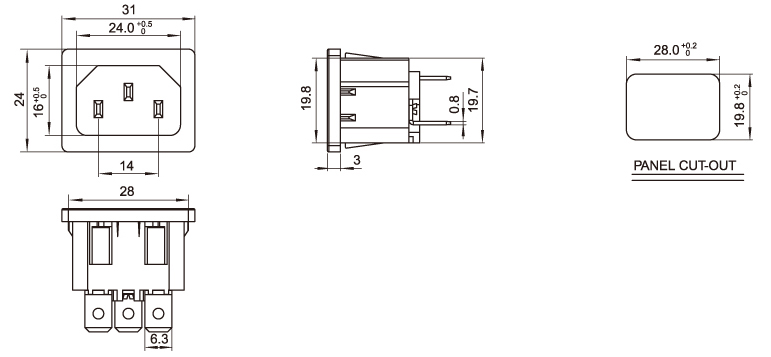 型 号:DB-14-5P-WW: 关健词:品字尾插座、品字尾电源插座、品字插座、AC电源插座、器具插座 用 途:小家电品字电源;主机机箱插座;电瓶车电源插座;电器插座 尺 寸:31*24 电流电压:10A 250V