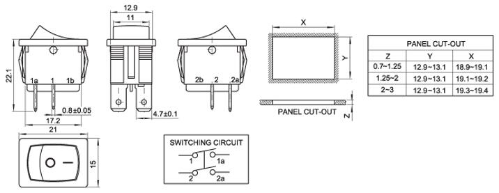 15*21 船型开关 跷板开关 IO电源开关 1.额定工作电压、电流Rating 3A/6A/15A 250V 2.使用温度范围Temperature -25+85℃ 3.接触电阻Contact Resistance <0.03Ω 4.动作力Actuating Force 1.3+0.5N 5.绝缘电阻Insulation Resistance >100MΩ 6.寿命(switching Life) 10000次