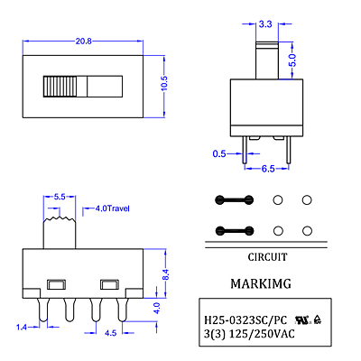 工作温度范围Operating temperature range:-30℃to+85℃ 额定电流Rating:6A 250V AC 绝缘电阻Insulation resistance: 100MΩ min.500V DC 接触电阻Contact resistance: 30m Ω max. 操作力度Operating fore:250±100gf 寿命Life time:10000 cycles(依产品而定)